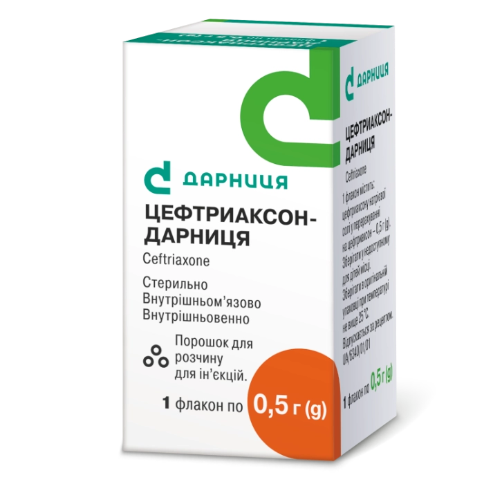 Ціна на Цефтриаксон-Дарниця порошок для розчину для ін'єкцій по 0,5 г, 1 шт. актуальна при замовленні на сайті. На apteka24.ua можна купити Цефтриаксон-Дарниця порошок для розчину для ін'єкцій по 0,5 г, 1 шт. з доставкою в такі міста України: Київ, Харків, Дніпро, Одеса, Рівне, Біла Церква, Вінниця, Запоріжжя, Івано-Франківськ, Краматорськ, Кременчук, Кривий Ріг, Кропивницький, Львів, Луцьк, Маріуполь, Миколаїв, Полтава, Суми, Тернопіль, Херсон, Житомир, Хмельницький, Черкаси, Чернівці, Чернігів. В інші міста замовлення можуть доставлятися через службу доставки. Доступна доставка кур'єром. Докладніше про способи, вартості та обмеженнях доставки.
